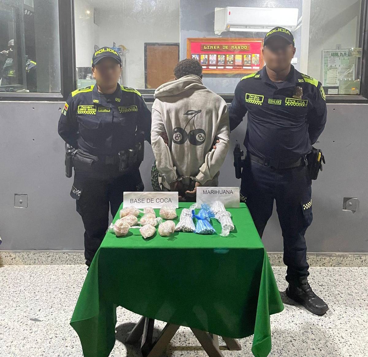 El capturado, conocido como alias ‘el Guti’, de 26 años, tenía en su poder cerca de 500 dosis de estupefacientes, entre marihuana y base de coca, que estaban listas para su distribución.