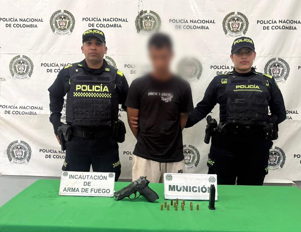 Durante el registro, los policías le hallaron una pistola calibre 9 milímetros, un proveedor y 13 cartuchos, elementos que no contaban con la documentación requerida para su porte legal.