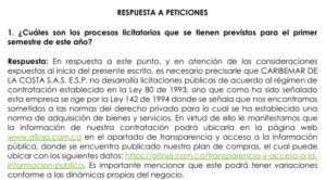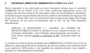 En la respuesta, la compañía —cuyo nombre jurídico es Caribemar de la Costa S.A.S. E.S.P.— explicó que, presuntamente, no está obligada a acogerse a la Ley 80 de 1993, que regula la contratación estatal en Colombia. En su lugar, presuntamente, aplica el régimen de derecho privado que le permite realizar contrataciones directas o «a dedo», como lo han calificado críticos del modelo.