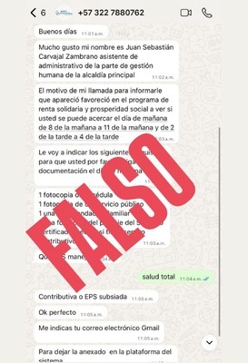 La Administración Municipal de Montería alertó a la ciudadanía sobre una nueva modalidad de estafa que circula a través de mensajes de WhatsApp, en la que una persona se hace pasar por funcionario público para ofrecer supuestos cupos en programas como “Renta Solidaria” o “Prosperidad Social”.