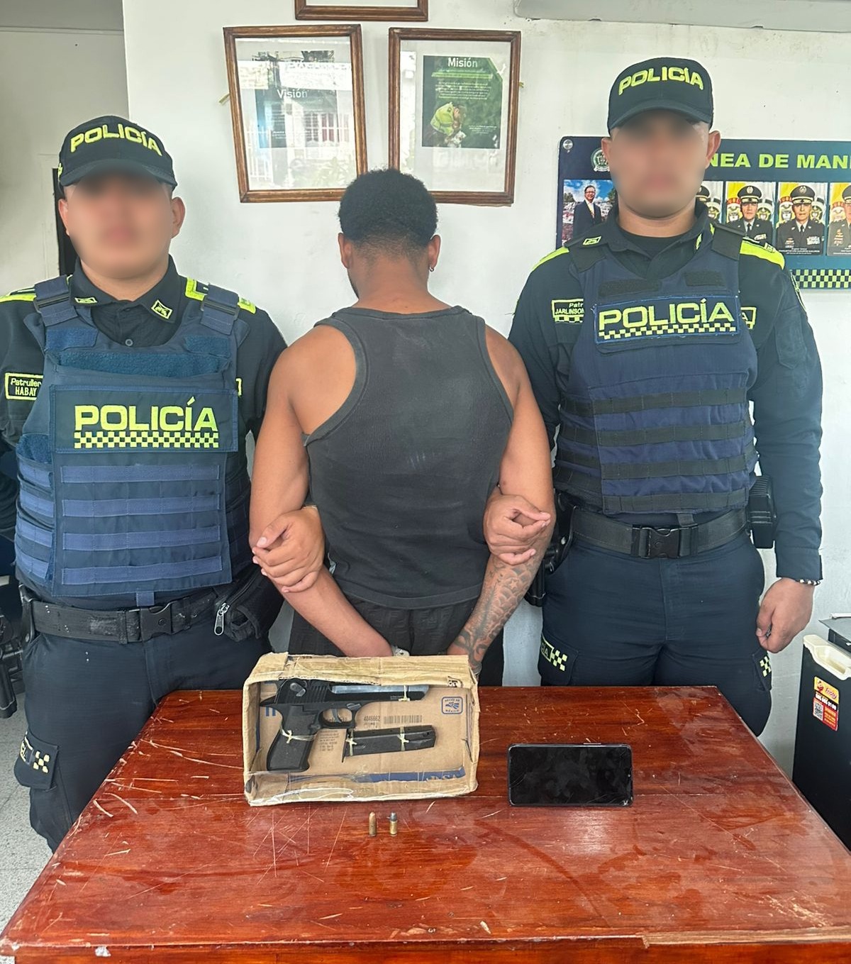 La Policía Nacional capturó en las últimas horas a alias ‘El Omar’, un hombre de 26 años señalado de cometer varios hurtos en el sector Primero de Mayo, en Cartagena. La detención se produjo gracias a la rápida reacción de las patrullas de vigilancia, que lo interceptaron cuando portaba una pistola 9 milímetros con cargador y dos cartuchos.
