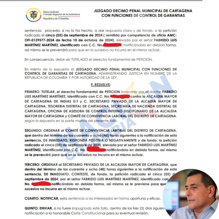 En un fallo reciente, el Juzgado Décimo Penal Municipal de Cartagena, en su función de control de garantías, ordenó tutelar el derecho de petición de Fabrizio Luis Martínez Martínez, director de Nación Colombia y su filial Nación Costeña. Martínez había solicitado información detallada sobre los gastos y reportes de la administración distrital a la Alcaldía Mayor de Cartagena y otras dependencias. El tribunal exigió una respuesta inmediata y sustantiva a la solicitud que había sido presentada previamente.